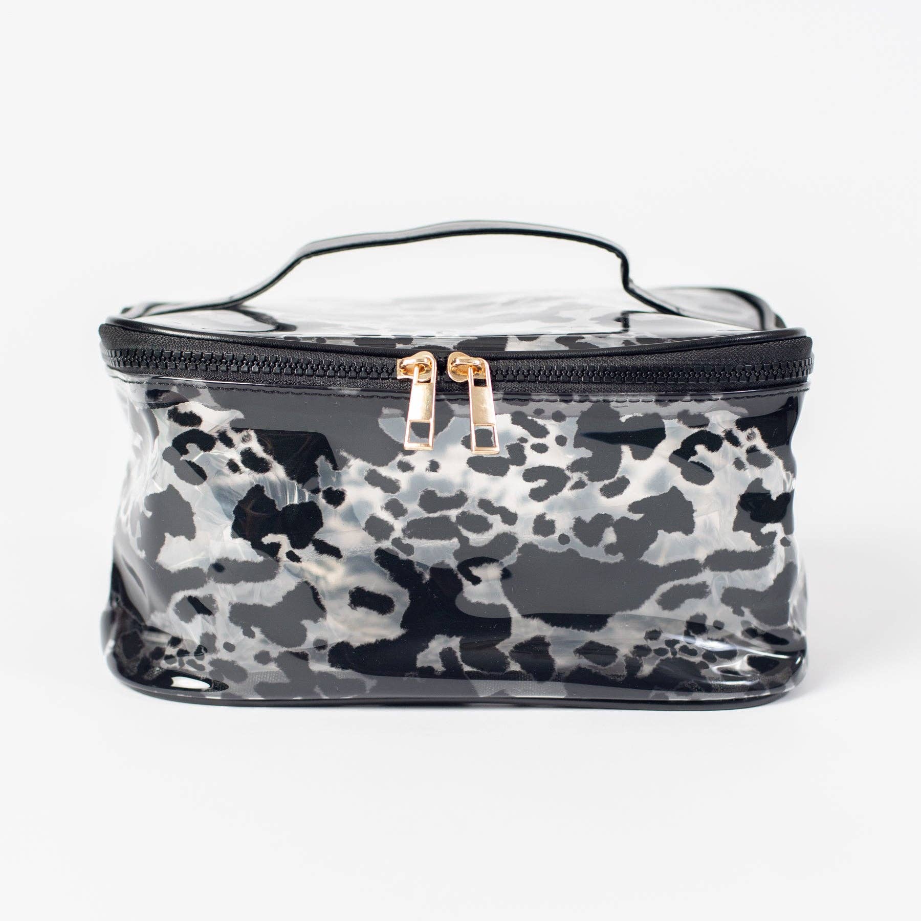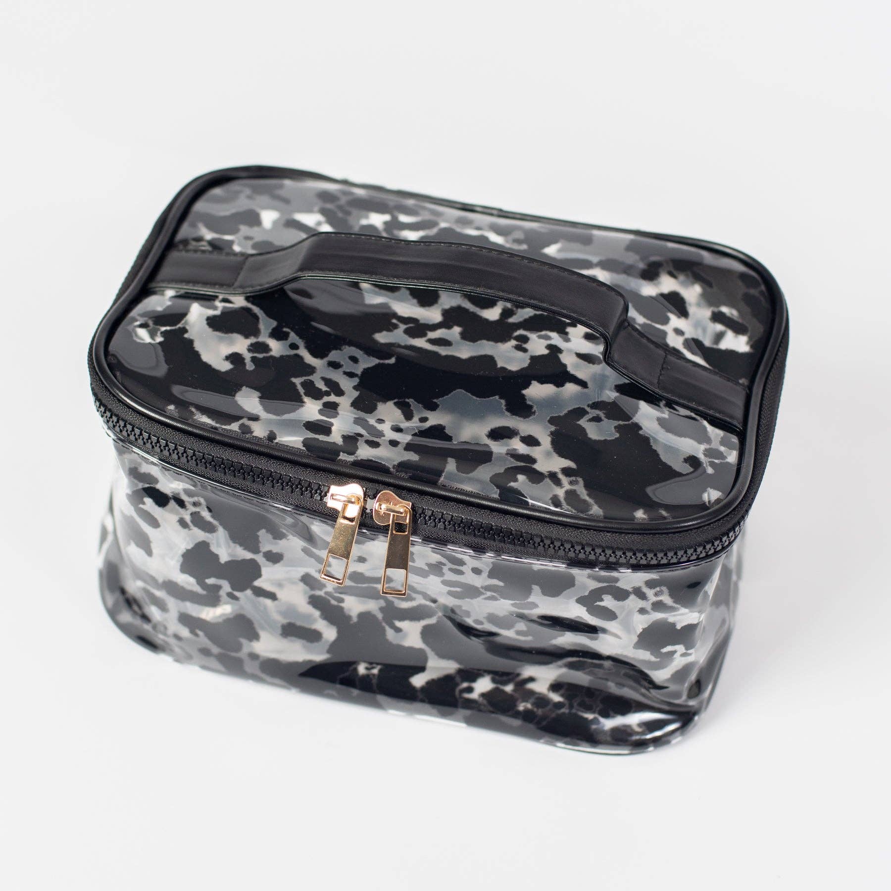 This big clear cosmetic bag features a fun black cow spot pattern that adds a playful touch to your beauty routine. Its spacious design easily holds all your essentials, while the sturdy black zipper keeps everything secure. Perfect for organizing your makeup with a quirky twist! Specifications: Clear w/ Cow Print Design Top Handle 5" H x 6" D x 9.5" FINAL SALE