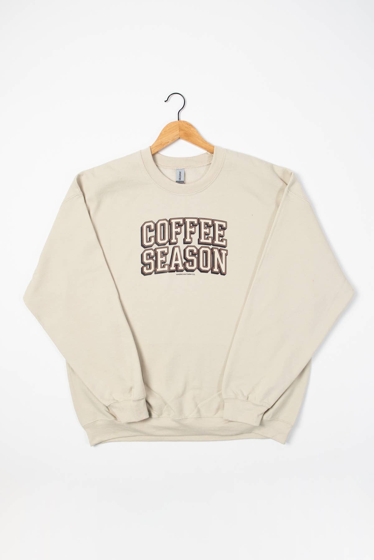 Stay cozy and caffeinated with this playful 'Coffee Season' crewneck. Made from soft Gildan fabric in a warm sand/tan color, it features bold lettering that celebrates your love for all things coffee. Perfect for chilly mornings or casual outings, this sweatshirt blends comfort with a fun, spirited vibe. Specifications: Gildan Heavy blend Sand 50% Cotton 50% Polyester (Colors may vary on different viewing devices) Care Instructions: To keep your items looking fresh and new as long as possible, we recommend the following: Machine wash cold with like colors, and hang to dry or tumble dry.