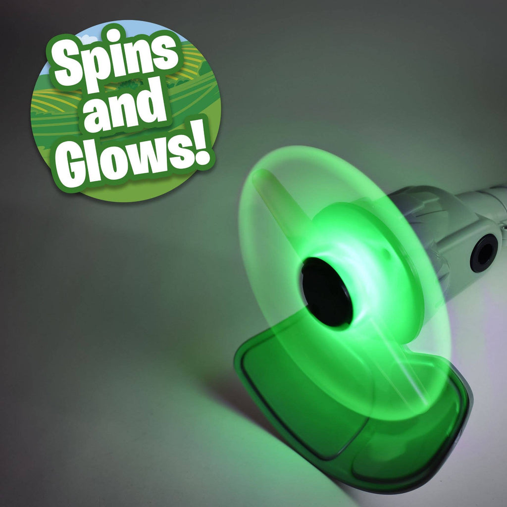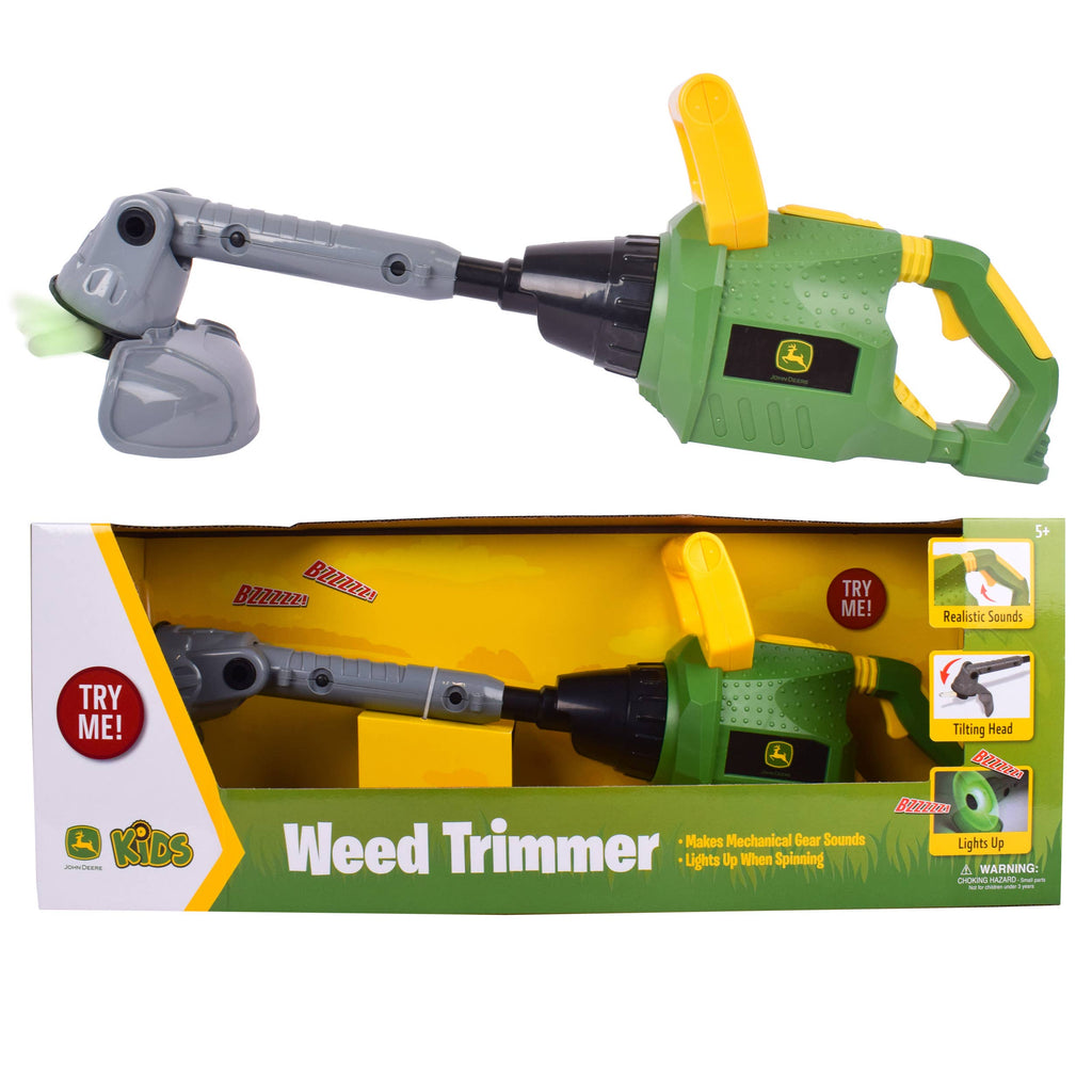 Has the look of a real John Deere weed trimmer, just smaller. Makes realistic mechanical gear sounds. Features tilting head and lights up when spinning. "Bzzzzz, bzzz".